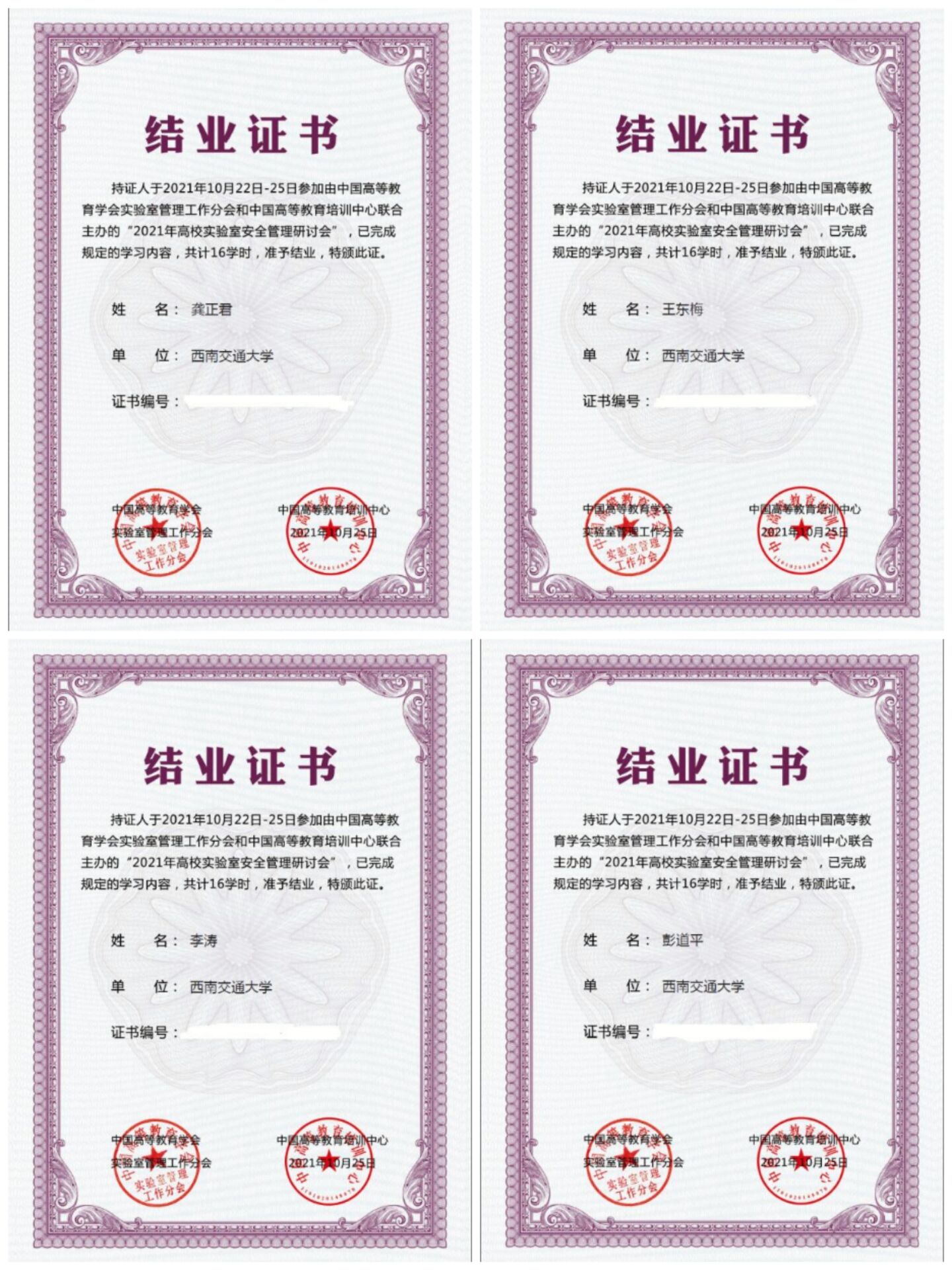 为落实教育部关于切实维护高校安全稳定的统一部署,做好学校关于二级学院实验室的安全保障工作,深入推进实验室安全管理工作规范化、专业化、信息化,提升高校实验室安全管理能力和水平,学院党政领导高度重视,予以经费支持,在学院分管实验室安全工作领导龚正君副院长的带领下,我院安全秘书、实验室主任、实验室教师,在严格遵守我校及参会当地疫情防控各项要求前提下与资实处相关领导及其他兄弟院系相关教师积极参会,共同认真学习并完成相关任务,取得中国高等教育培训中心结业证书。