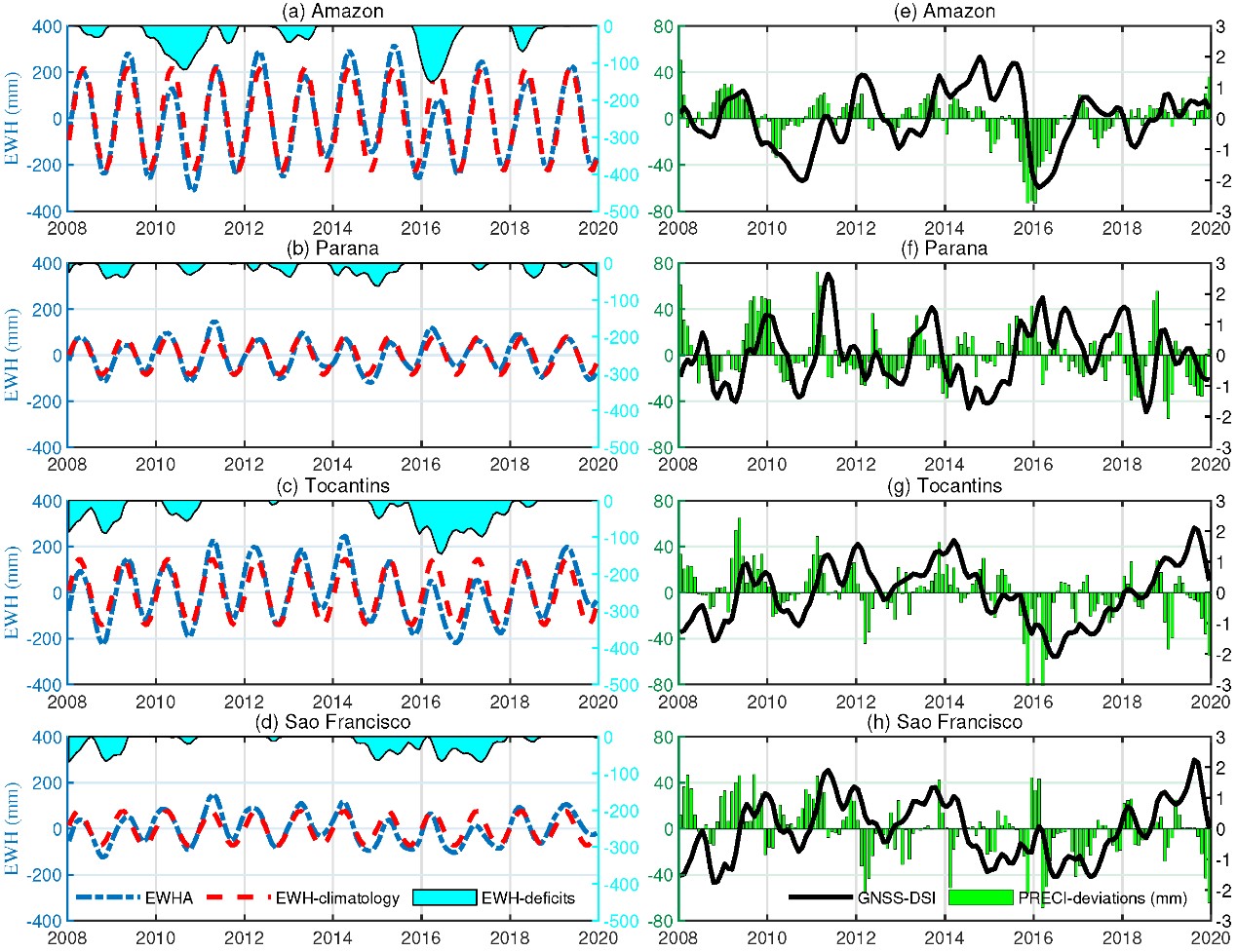 图四 利用GNSS定量描述巴西四大流域的干旱事件特征 (发表于Earth and Planetary Science Letters)