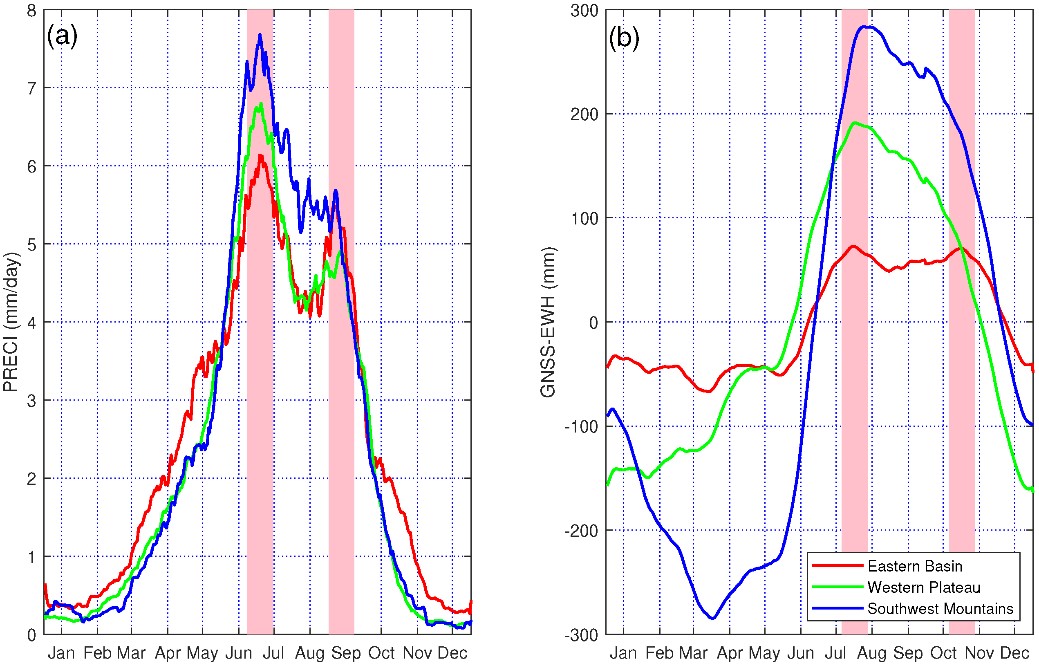 图二 四川地区不同地理区域(川西高原、四川盆地与川西南山地)多年平均的单天降雨和GNSS反演的陆地水储量结果 (发表于Journal of Geophysical Research: Solid Earth)