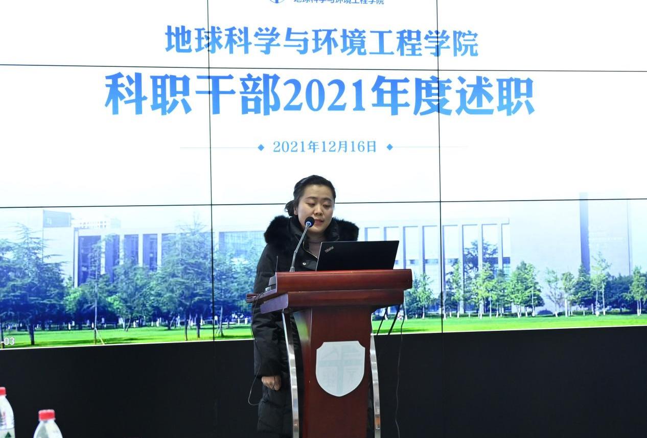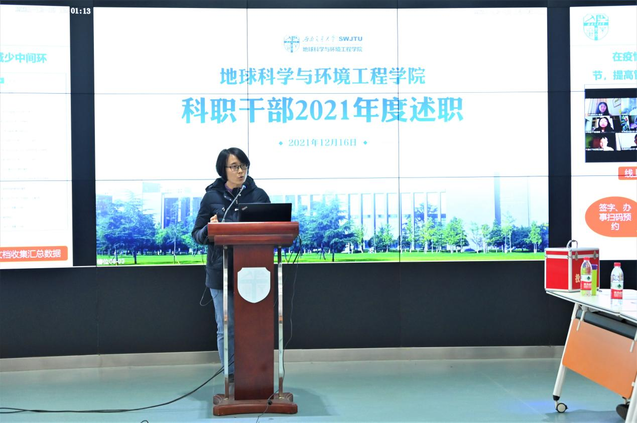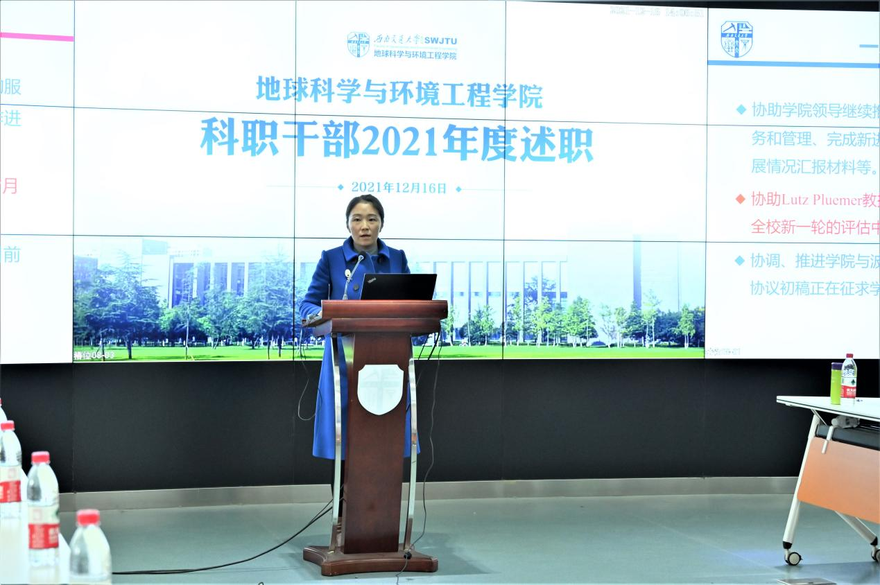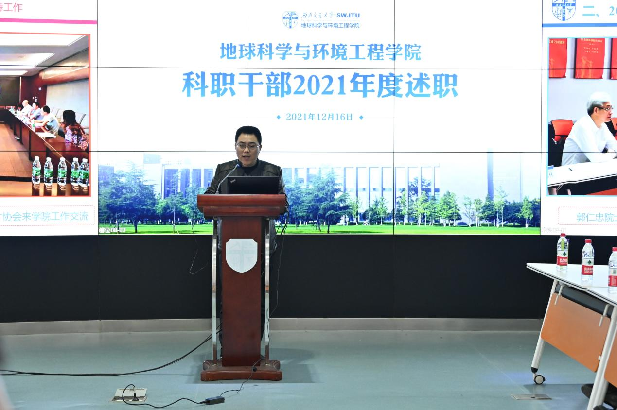 于X4243召开科职干部2021年度述职大会。学院党委书记关秦川,党委副书记、副院长许军华,党委副书记、纪委书记傅尤刚,副院长张玉春,以及机关各部门共同参与此次会议。党务秘书李晓宇、综合事务办主任杜鸿、综合事务办(国际化方向)主任关方、教育教学办主任闫玲、学科学术办主任周青、学生工作办主任杨都强等6名老师进行现场述职。