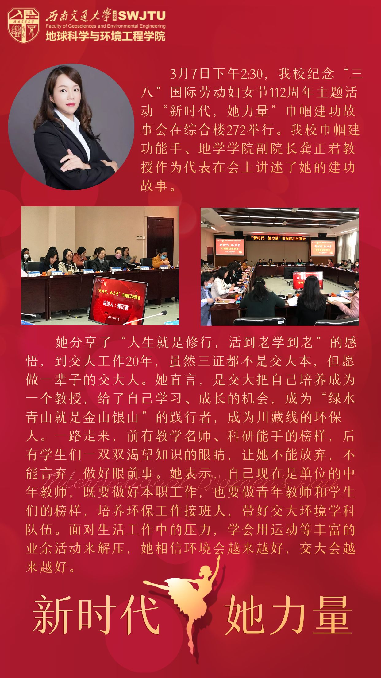 我校巾帼建功能手、每日大赛 副院长龚正君教授在纪念“三八”国际劳动妇女节112周年主题活动“新时代,她力量”巾帼建功故事会上作分享交流