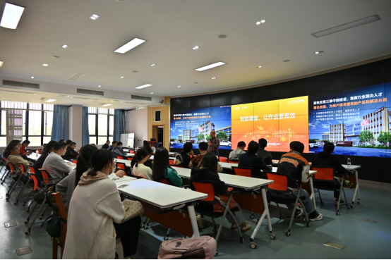会议分为两项议程。第一项议程,华测导航技术股份有限公司副总裁胡炜进行招聘宣讲,学院测绘类专业本硕学生参加。胡炜向同学们介绍了公司今年的校招情况,回顾了在模拟测绘到数字测绘、信息测绘再到智能测绘的发展过程中,测绘装备的升级是如何一步步推动测绘技术的进步和发展,并通过大量应用和案例,讲述智能装备是如何让作业更高效。同时,他对公司优厚的薪酬待遇、招聘流程及方式进行说明,并对同学们关心的岗位要求、发展期望等问题予以耐心解答。