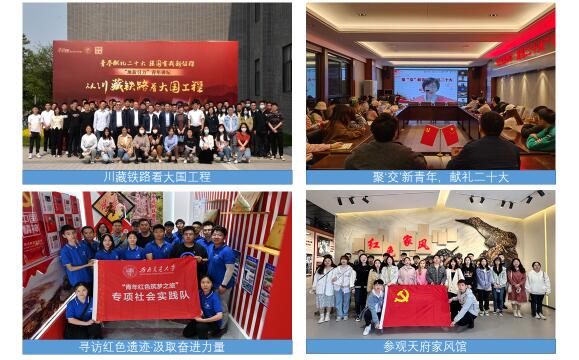 坚定理想信念,把稳实践育人方向。通过“学习二十大精神,争做新时代先锋”主题活动深入学习宣传贯彻党的二十大精神;通过“寻访红色遗迹·汲取奋进力量”——川藏铁路沿线党史研学实践活动,在红色遗迹中汲取奋进力量。通过“聚‘交’新青年,献礼二十大”与上海交通大学、西安交通大学、北京交通大学联合学习,将理想信念教育与实践相结合。通过带领学生骨干参观“天府家风馆”等校外爱国主义教育基地,厚植爱国主义情怀与优良思想道德品质。