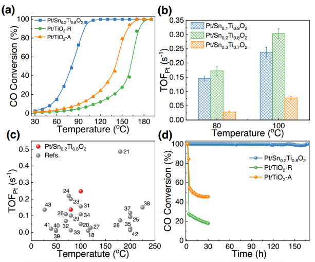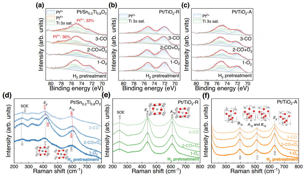总而言之,将Sn掺杂到载体TiO2后激活了低温(<100°C)下Pt/TiO2催化剂中的氧逆溢流过程,显著提升了Pt/TiO2催化剂的CO氧化活性。结合NAP-XPS、原位拉曼/红外光谱和从头算分子动力学模拟,揭示了氧逆溢流过程是指CO在Pt2+位点的吸附引发Sn-O-Ti键断裂,随后O迁移至活性位点导致Pt4+的生成。本研究清晰地描述了由CO吸附引发的氧逆溢流界面化学过程,理解这一过程有助于设计适用于各类催化反应的催化剂体系。