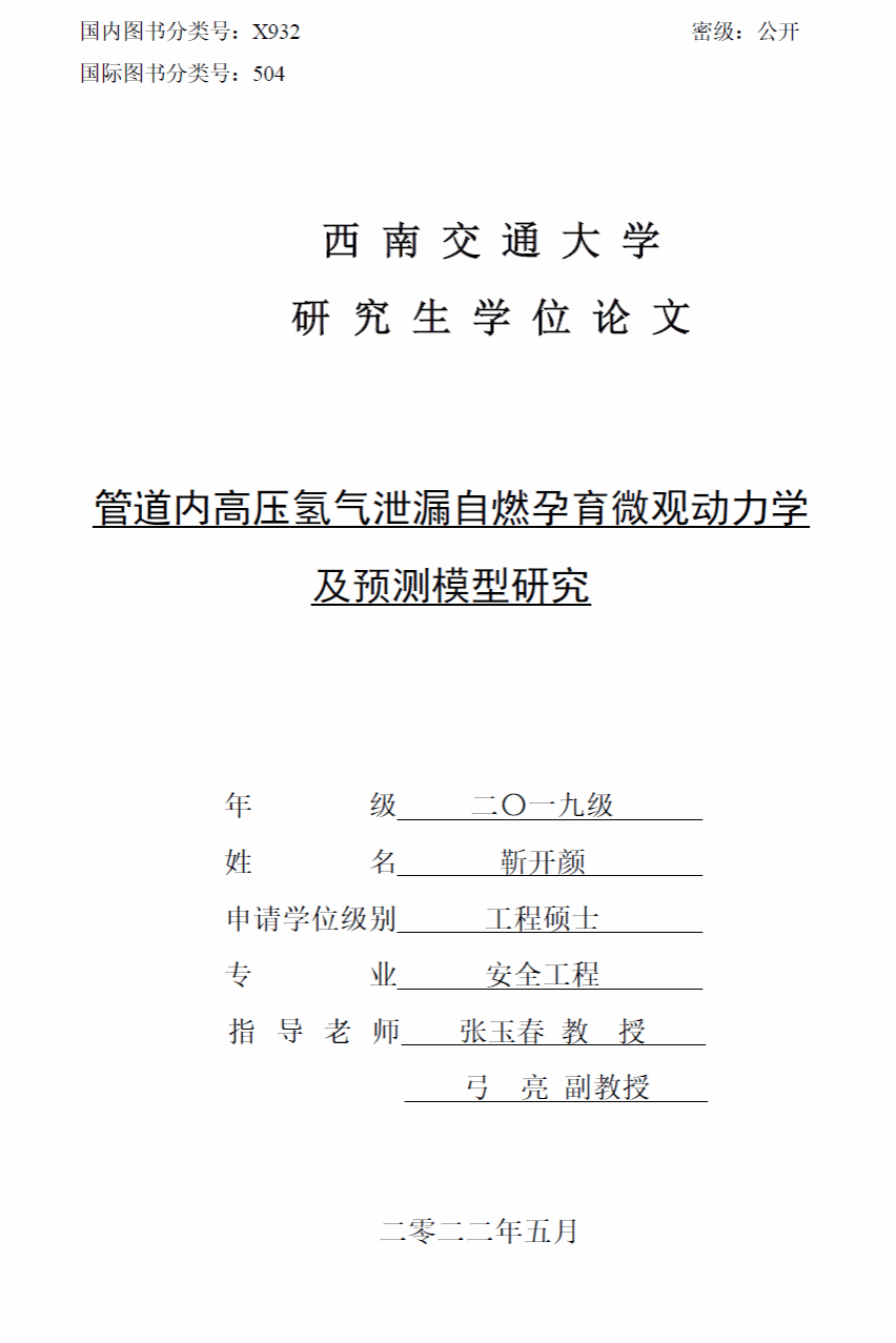 靳开颜为消防工程系2019级硕士,于2022年6月取得硕士学位,被评为四川省优秀毕业生。硕士期间,在张玉春教授及弓亮副教授指导下,针对高压氢气泄漏自燃机理开展了数值模拟和实验研究工作,研究成果发表于Combustion and Flame,International Journal of Hydrogen Energy,Journal of Energy Storage,Journal of Loss Prevention in the Process Industries,Safety Science等国际期刊。主要研究成果包括: