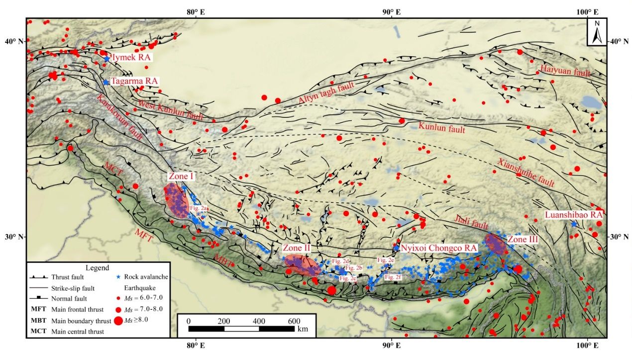 图1 青藏高原主要断裂构造、强震活动及高速远程滑坡分布图