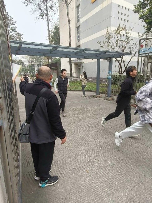 在疏散过程中,校保安队员、志愿者与工作人员协同合作,分布在疏散路线上,耐心指导并维护秩序。楼内的学生在短短20分钟内完成了撤离,并按照预案指引安全集结至犀浦北区体育场。