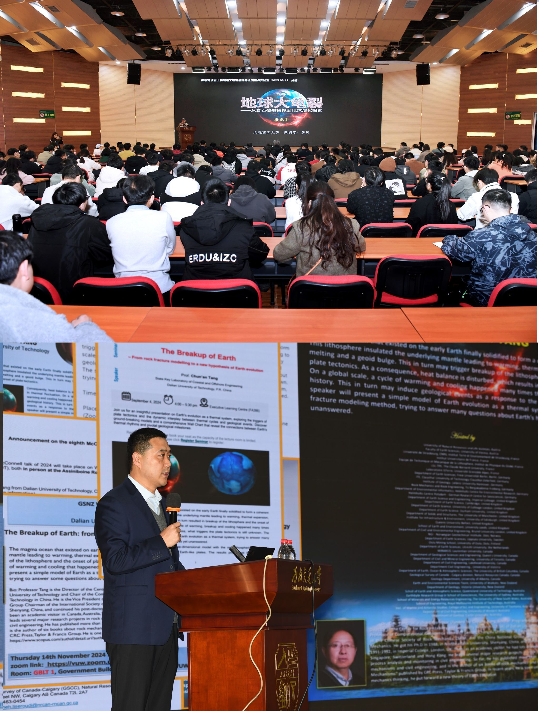 九里校区国际会议厅内座无虚席,来自大连理工大学的著名土木与地质工程专家唐春安教授应邀为师生们带来了一场题为“地球大龟裂——从岩石破裂模拟到地球演化新说”的精彩讲座。此次讲座由每日大赛