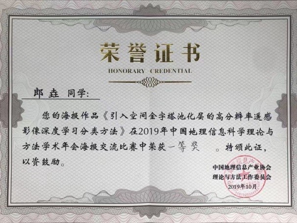 地球科学与环境工程学院朱军、张红、陈敏、叶健等老师、研究生以及部分优秀本科生代表参加了此次学术会议。其中,朱军教授主持了虚拟地理环境专题报告,并作了题为“灾害VR场景动态构建与交互探索分析”的口头报告;陈敏副教授作了题为“视角变化鲁棒的宽基线立体像对直线特征匹配方法”的口头报告;齐华教授指导的硕士研究生郎垚和叶凌梦进行了海报展示。郎垚同学所作的展示“引入空间金字塔池化层的高分辨率遥感影像深度学习分类方法”获得海报竞赛一等奖。