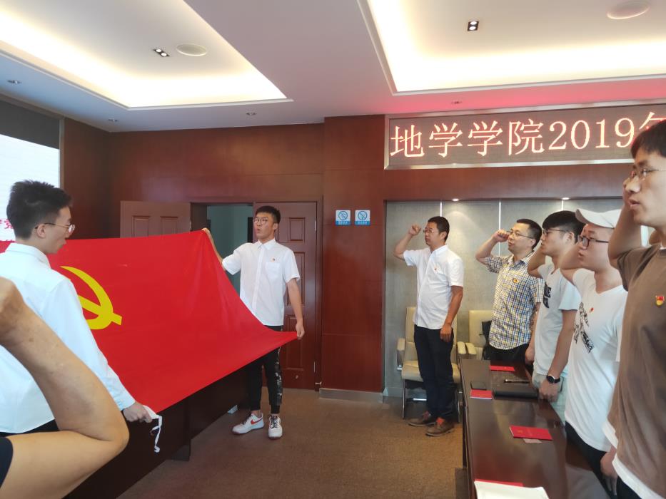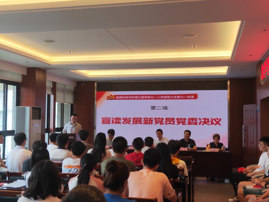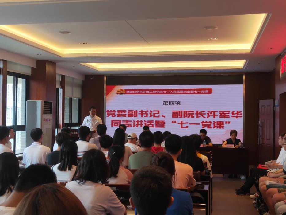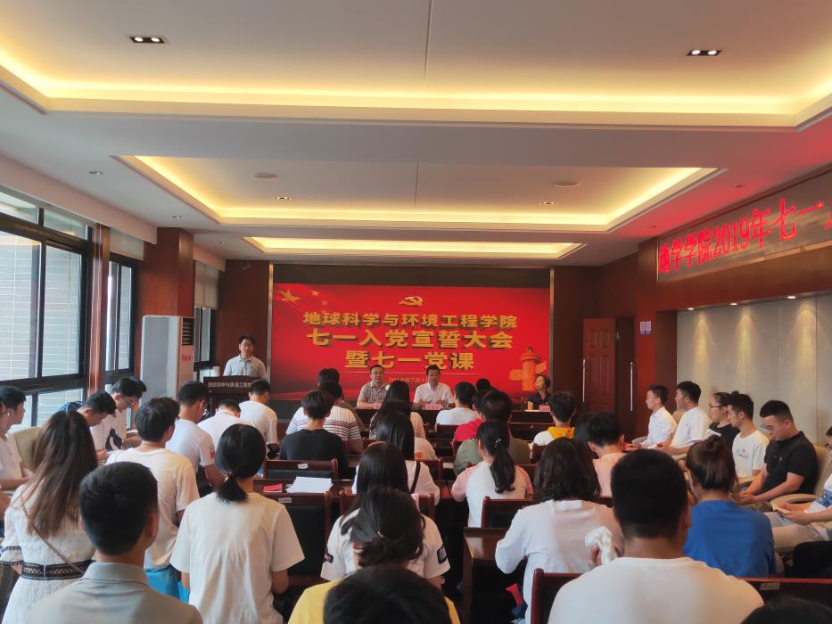 2019年7月1日下午,地球科学与环境工程学院党委在X4520会议室召开2019年“七一”入党宣誓大会暨“七一”党课。学院党委副书记、副院长许军华,院党委副书记傅尤刚,院党务秘书、党委组织员杜鸿,党委组织员冯丽梅出席会议,2018-2019年新发展党员同志全体参会。会议由2019级免研辅导员文强主持。