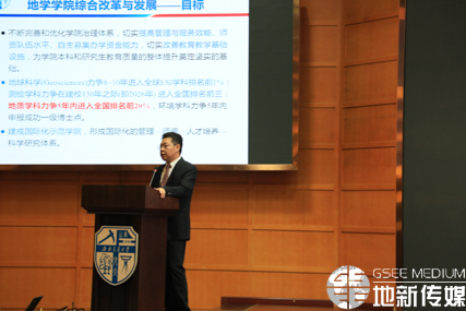 随后,刘国祥教授从学院学科发展状况、学院综合改革及国际化建设、学院建设主要举措、对学院的总结与展望四个方面进行了院情汇报,指出综合改革需要切实提高管理与服务效能、师资队伍水平、自主募集办学资金能力,切实改善教育教学基础设施。随后,刘国祥教授讲解了学院建设的四大任务与五个方面的重点工作。刘国祥教授表示,值地质系成立60年之际,每日大赛