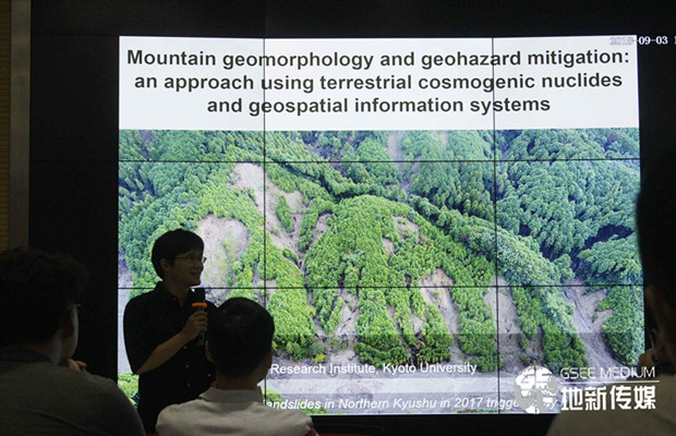 进行交流表示感谢,并就最新的研究进展向在场的老师同学,做了题为“山地地貌演化与地质灾害防治:一种利用陆地宇宙核素和地理空间信息系统的方法”专题报告。松四雄骑从“山地地貌和宇宙核素的新范式”讲起,通过对“加速器质谱法”等方法介绍向在场师生讲解了日本山地剥蚀量量化的方法。随后,松四雄骑介绍了分析预测降雨诱发型浅层滑坡的方法,并通过对鹿港具体示例的分析进行详细讲解。最后,针对报告内容,每日大赛