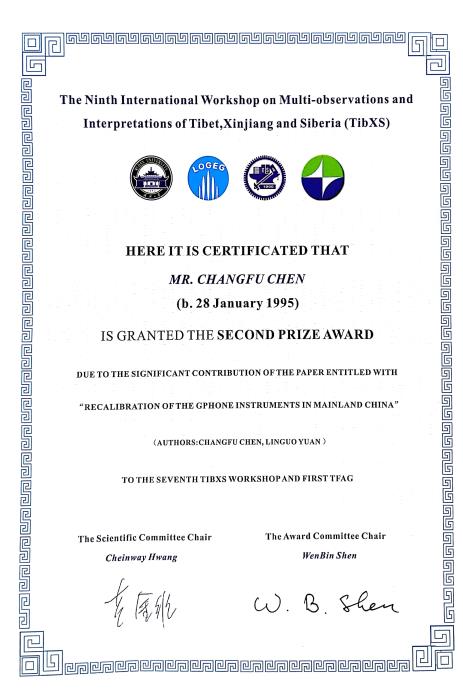 此次研讨会的主题是西藏新疆西伯利亚地区的多元观测数据处理及解释。会议主要围绕重力变化、GRACE观测及应用、卫星测高、地壳结构、地球自转、地震观测以及地学研究中时间频率应用等关键专题进行学术交流,重点探讨了地下水观测、负荷形变以及重力观测等前沿性科学问题。我院测绘遥感信息系袁林果教授的博士生由晓文、陈昌福和硕士生徐小凤参加本次会议,并分别作了“The sensitivities of ocean tide loading displacements to the upper mantle and crust in Taiwan”、“Recalibration of the gPhone instruments in mainland China”和“Qinghai lake level changes determined by Cryosat-2 altimetry data and its impacts on surface loading deformation”的学术报告,均赢得了会场的热烈讨论和提问。在本次会议中,博士研究生陈昌福获得最佳论文奖,专家学者高度称赞了博士生由晓文和硕士生徐小凤的相关研究工作,并鼓励他们再接再厉,取得更加突出的研究成果。