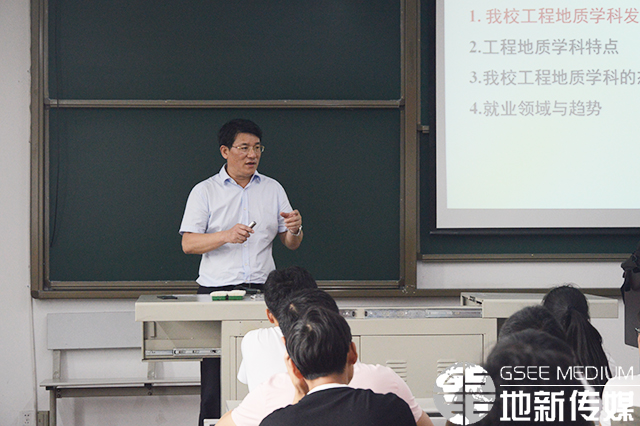 胡卸文以我校工程地质学科发展历史为引,简要介绍了我院的工程地质学科建设过程、我校工程地质学科的历史沉淀、师资力量、科研力量、本硕博培养目标及近几年国内外学术会议的承办情况,并介绍了工程地质学科的主要研究内容。随后,胡卸文就工程地质学的基本特点等进行了介绍。通过对意大利比萨斜塔、溪口滑坡等著名的地质事件的讲解,向同学们讲述了滑坡、塌陷等地质灾害及灾害的发生原因,同时讲解了地质工程学科的研究对象及研究内容。接着,胡卸文向在场同学详细讲解了当下地质工程的在多种不同领域的重要性,并就本专业发展前景向同学们进行介绍。