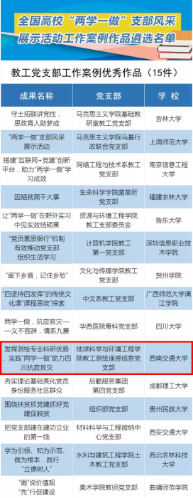 我院教工测绘遥感信息党支部,题为“发挥测绘专业科研优势、实践‘两学一做’助力四川抗震救灾”的工作案例,获得了教师党支部推荐展示优秀作品,生动形象地展示了学校教师以专业助力国家抗震救灾的重要贡献。