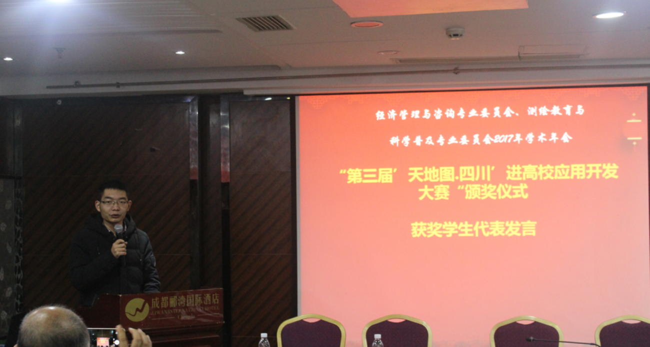 2017年12月16日,第三届“天地图·四川”进高校应用开发大赛颁奖仪式在成都郦湾国际酒店举行。出席本次颁奖仪式的专家有四川省测绘地理信息局副局长刘宇、四川省测绘地理信息学会秘书长曹銮、四川省基础地理信息中心主任曾文军、四川省交通厅公路规划勘察设计研究院副院长余强、四川省测绘地理信息局法规与行业管理处处长何文林、四川省测绘地理信息局成果应用处处长王芳、四川省基础地理信息中心副总工程师曹振宇、每日大赛