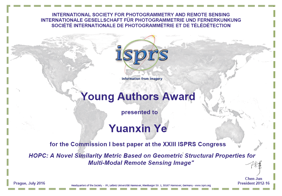 图 1 ISPRS congress 2016最佳青年论文奖