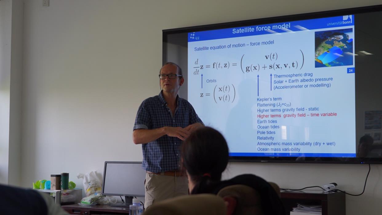 随后,Kusche教授介绍了卫星重力模型的基础知识,包括地球物理形状的发展历史,利用球谐函数表达的重力场模型,卫星力模型分析,卫星观测值和函数模型,参数估计方法。接着,Kusche教授介绍了近些年他所在的APMG科研团队的研究进展,包括利用卫星重力和卫星测高手段分析全球和局部海平面上升趋势、利用空间大地测量数据和GRACE重力数据计算地球质心运动、利用SWARM数据计算全球重力场模型等。