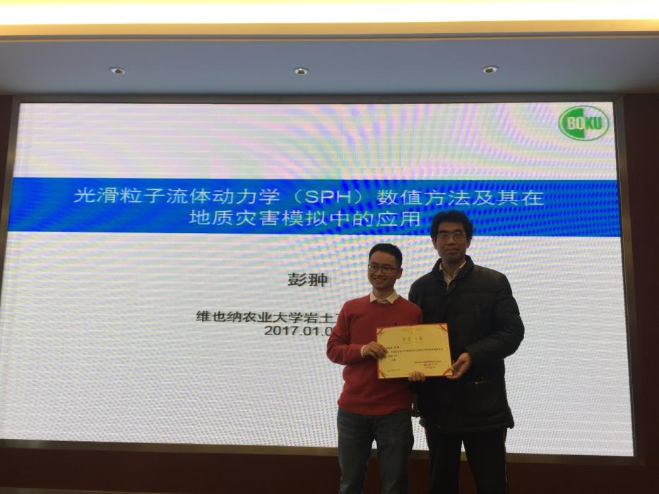 受聘仪式之前,彭翀研究员作了题为“光滑粒子流体动力学(SPH)数值方法及其在地质灾害模拟中的应用”的精彩学术报告。彭翀研究员在介绍SPH方法的基础上,通过大量算例展示了其近年来将SPH用于两类典型而复杂的地质灾害——滑坡和泥石模拟分析的研究成果,包括:(1)单相的SPH岩土材料模拟方法;(2)基于多相混合物理论的多层SPH粒子计算方法;(3)基于CPU-GPU大规模并行计算的SPH程序,可用于滑坡或边坡稳定分析,以及泥石流启动、流动和沉积的动力学全过程模拟。