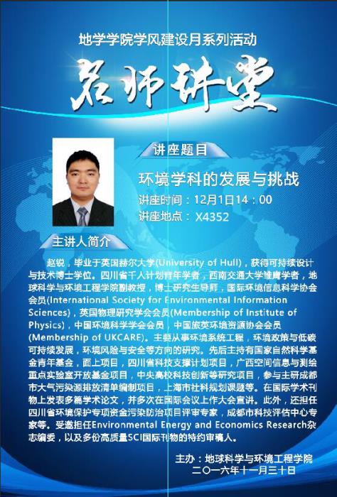 赵锐教授主讲,讲座题目为“环境学科的发展与挑战”。讲座由每日大赛