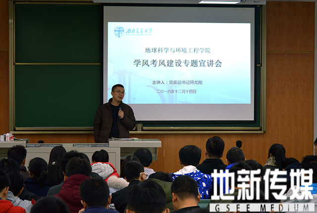 12月14日 地球科学与环境工程学院在X4155举行了安全教育与学风考风建设专题宣讲会,由院党委副书记傅尤刚主讲,2016级辅导员翟琦老师,2016级环境工程全体学生参加本次会议。