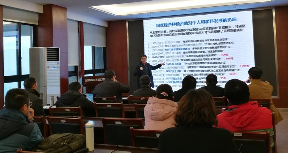 首先,遥感信息工程系朱庆教授做了题为《国家自然科学基金申请与实施》的专题报告。朱庆教授通过自身经历讲述了国家经费持续资助对个人和学科发展的影响,并结合历年来国家自然科学基金项目资助的多方面数据统计,提出要获得更多的项目资助应注意同行之间加强交流合作,学院加强组织、发挥个体优势,提升学科影响力。同时,朱庆教授从国家自然科学基金资助政策,评审规则,申请书的撰写,注意事项以及如何完成好基金项目等方面做了讲解。