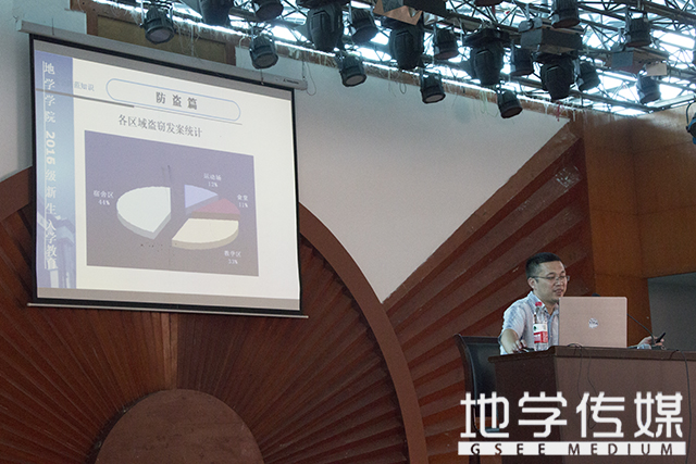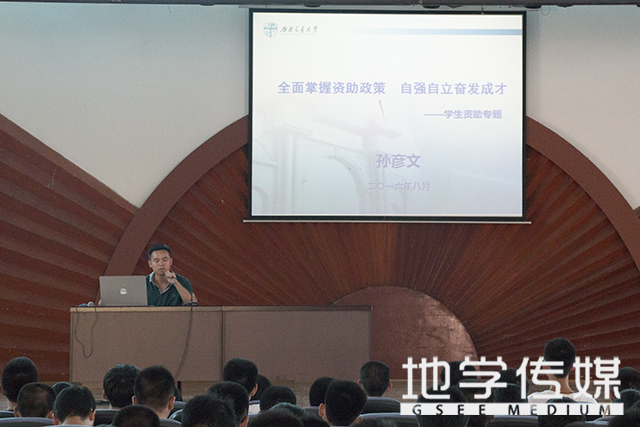 下午3点40分左右,学工组辅导员孙彦文主讲了学生资助的入学教育专题。