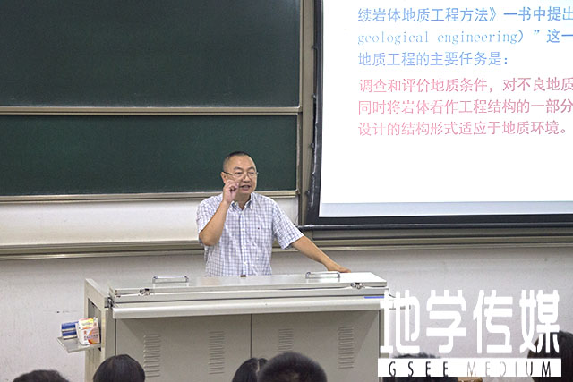 地质工程系系主任巫锡勇教授主要就地质工程特点以及起源、地质工程学科分类、地质工程专业方向与工程类型、地质工程密切相关的地质危害、专业发展前景以及我院地质工程系历史以及学科特色等多方面向新生全面展示了我院地质工程专业及院系设置的发展状况。