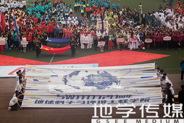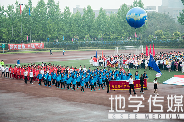 “雄赳赳,气昂昂,迎面向我们走来的是地球科学与环境工程学院的代表队。”伴随着主持人的解说,方阵队伍昂首挺胸、精神抖擞,在党委徐瑞堂、傅尤刚书记的带领下,迈着铿锵有力的不发,喊着嘹亮的口号向主席台走来。方队上方漂浮着的“地球”图案的气球展现了学院特色。随后,方队走至主席台前,迅速散开,开始了主题为“校庆120”的方队表演。师生们用纸板和横幅衔接巧妙地呈现出“1”、“2”、“0”字样。方阵中的同学手拿花捧,散开为花朵状队形。横幅相互交织而形成的“蓝色地球”画面让在场的观众一一喝彩,体育场上响起了热烈的掌声。