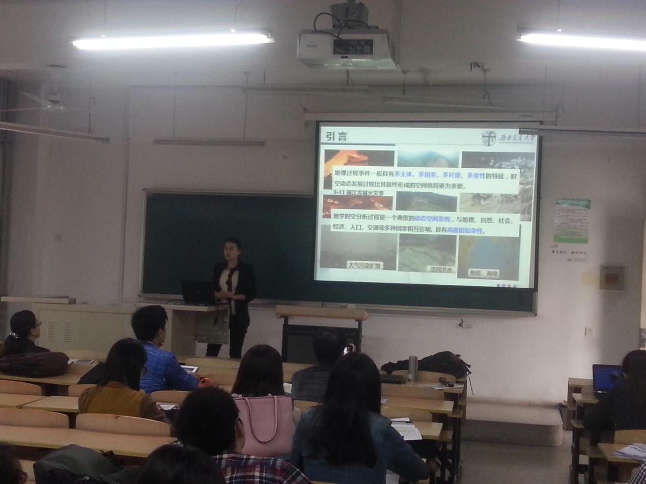 张恒、尹灵芝、龚循强分别就“高速列车耦合仿真情景下本体驱动的虚拟高速铁路场景动态建模”、“时空过程网络可视化模拟与分析-以溃坝洪水为例”、“加权总体最小二乘抗差估计方法的比较分析”做了大会交流报告。朱军副教授应邀主持了“地理建模与模拟”分会场报告。朱庆教授与解放军信息工程大学万钢教授共同策划与组织的“虚拟地理环境”专题沙龙吸引了众多听众,被誉为是本次年会中内容最新颖、讨论最热烈的沙龙之一。
