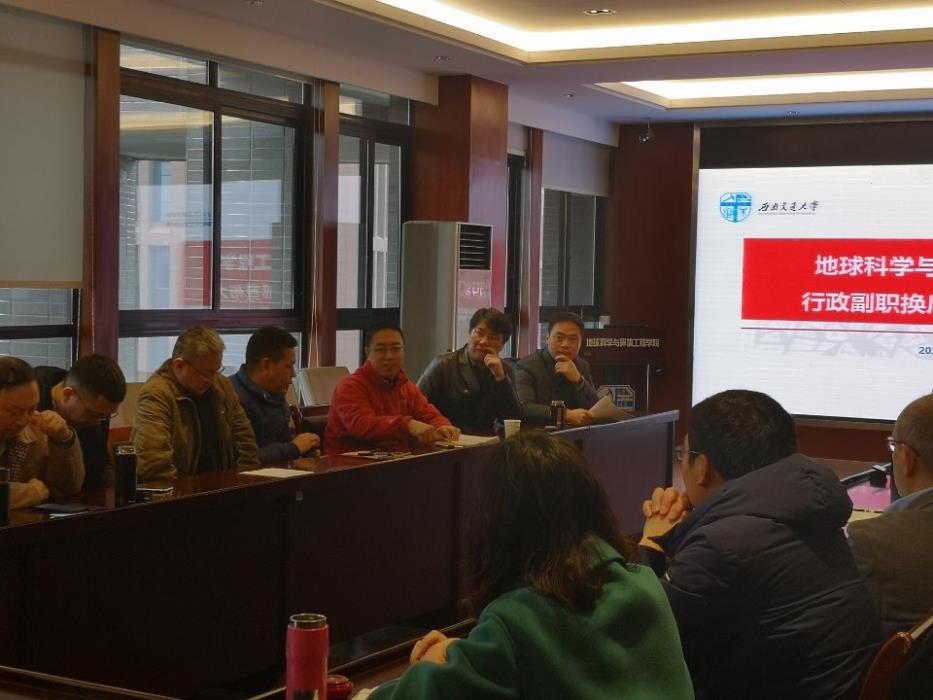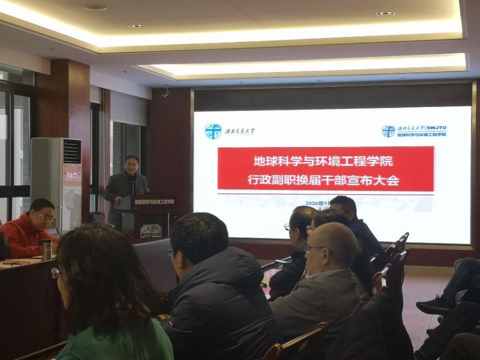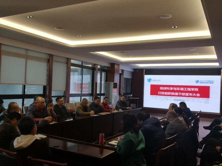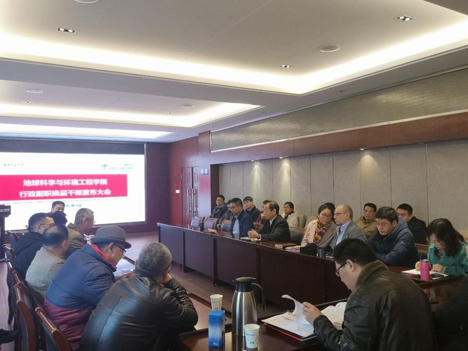 2019年1月14日,地球科学与环境工程学院于X4520会议室召开行政副职换届宣布大会,参加会议的有校党委组织部部长韩旭东同志,学院党政领导班子,各系系主任,以及教职工代表等。