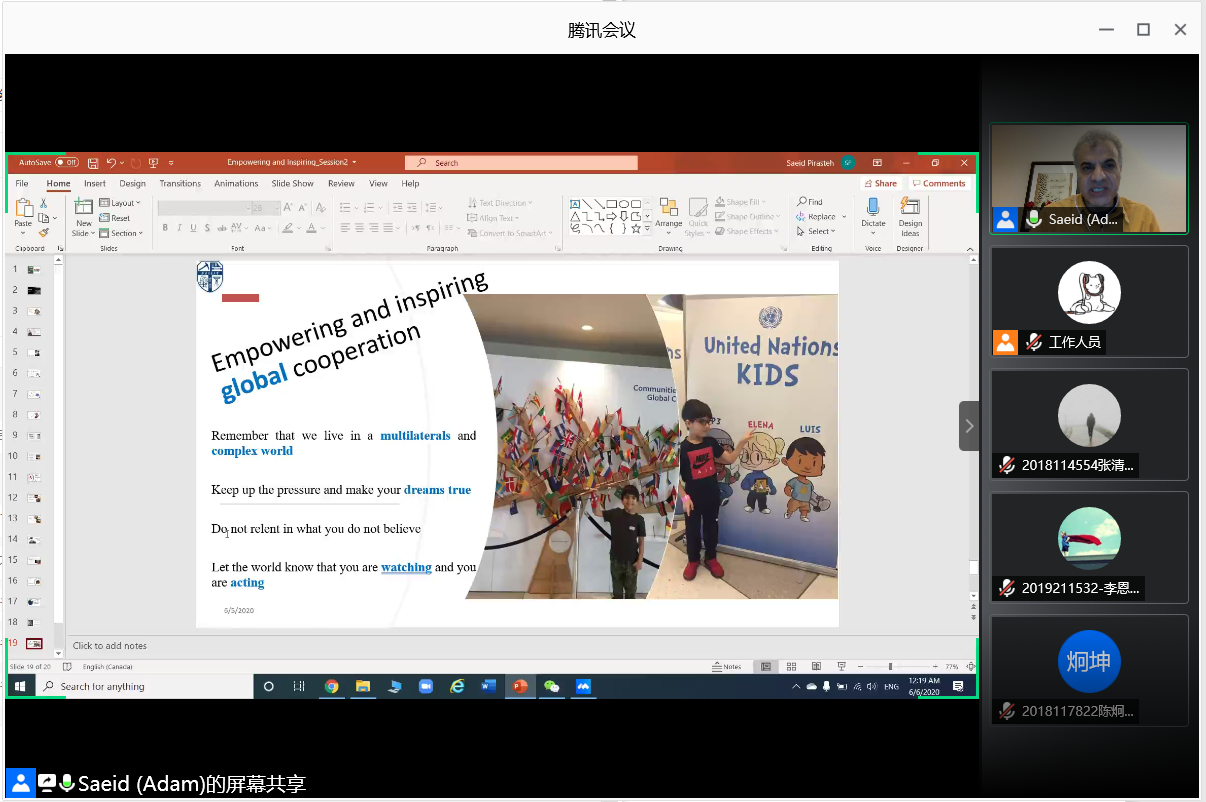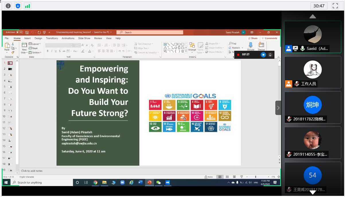 2020年6月6日上午11:00,地球科学与环境工程学院邀请学院外籍教师开展“国际化+名师讲堂”国际视野与出国留学系列第四期讲座,本次讲座通过线上平台“腾讯会议”进行,主讲人为Saeid(Adam) Pirasteh副教授,活动主题为Empowering and Inspiring to Build Your Future(激励你创建自己的未来)。讲座由每日大赛