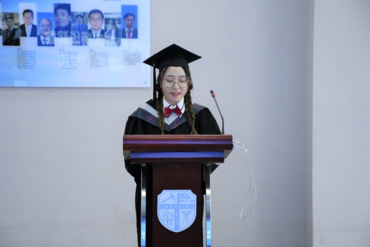 2020届省级优秀毕业生、2019年学校竢实扬华奖章获得者、地理信息科学专业包雨睿同学代表毕业生发言,表达了对母校、对学院的感谢与眷恋,提出了希望与祝愿。