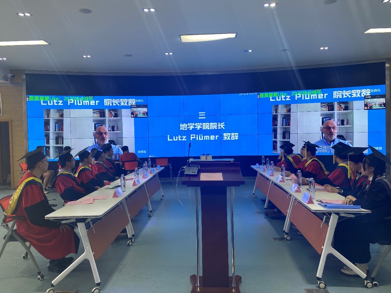 远在德国的Plümer院长线上表达对大家毕业的祝贺。对大家顺利完成大学本科的学习表示了祝贺,希望同学们要有充分的自信和勇气面对来自全球的竞争,为全球化带来的机遇和挑战做好准备,真诚地希望再见到同学们时,大家都能事业有成,大展宏图。