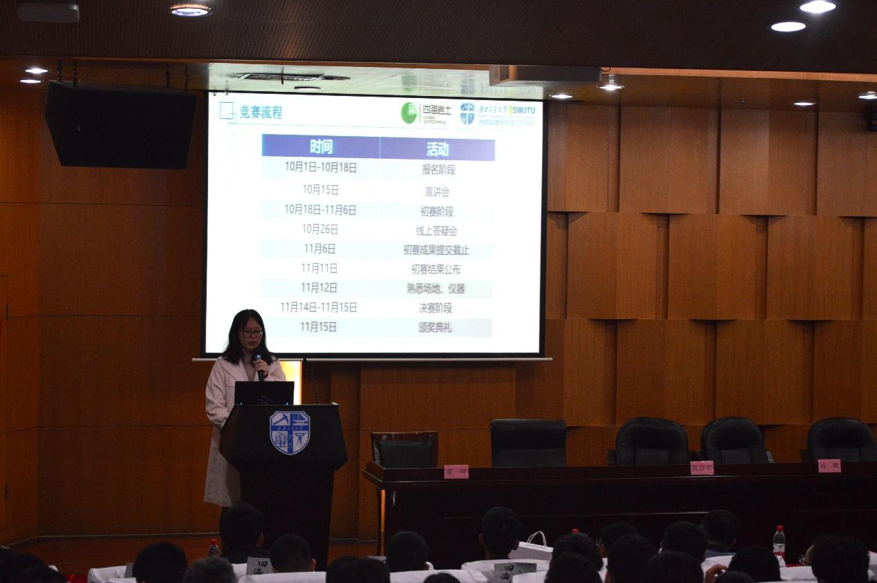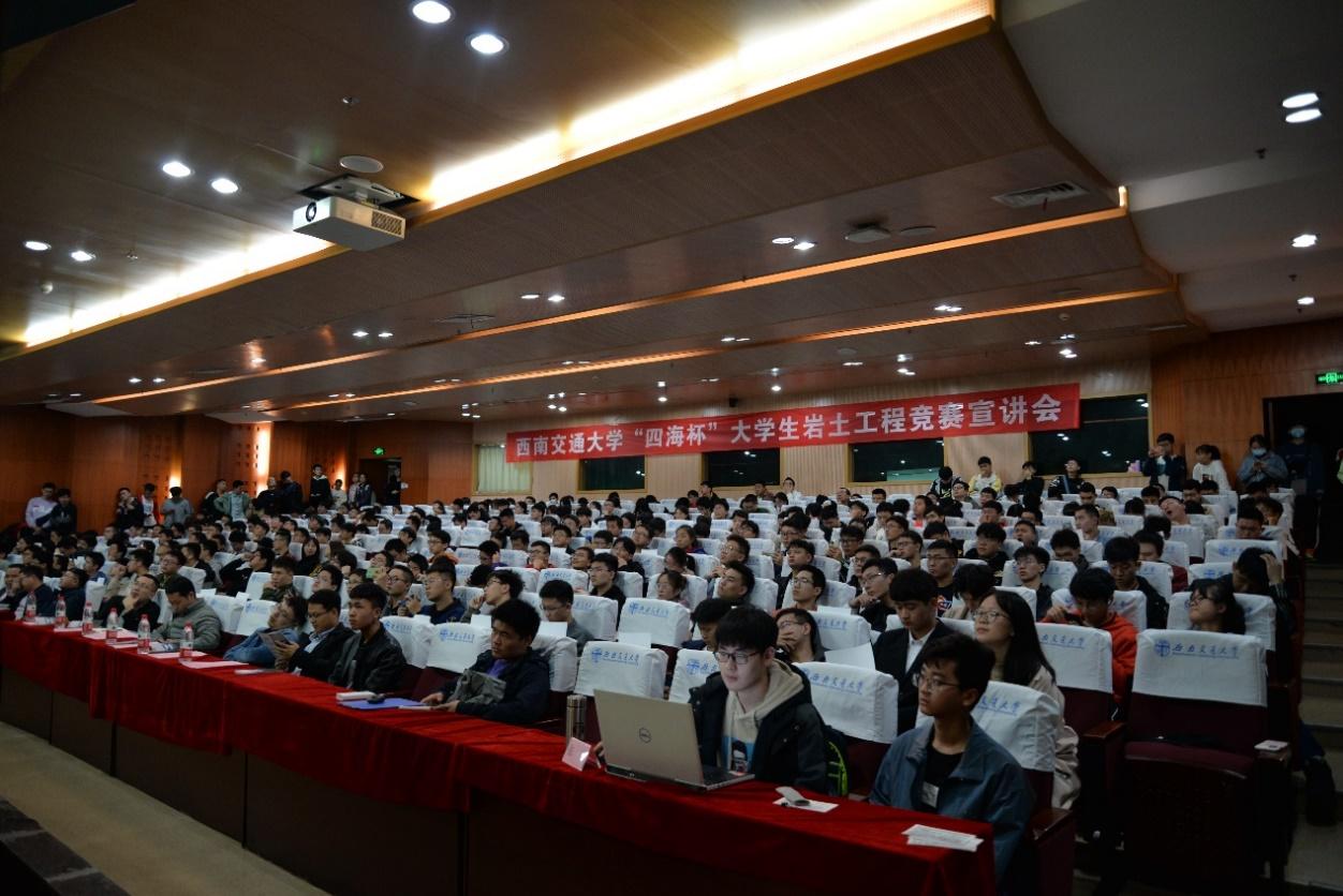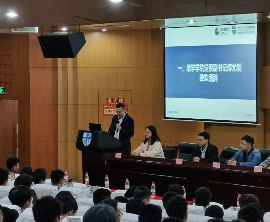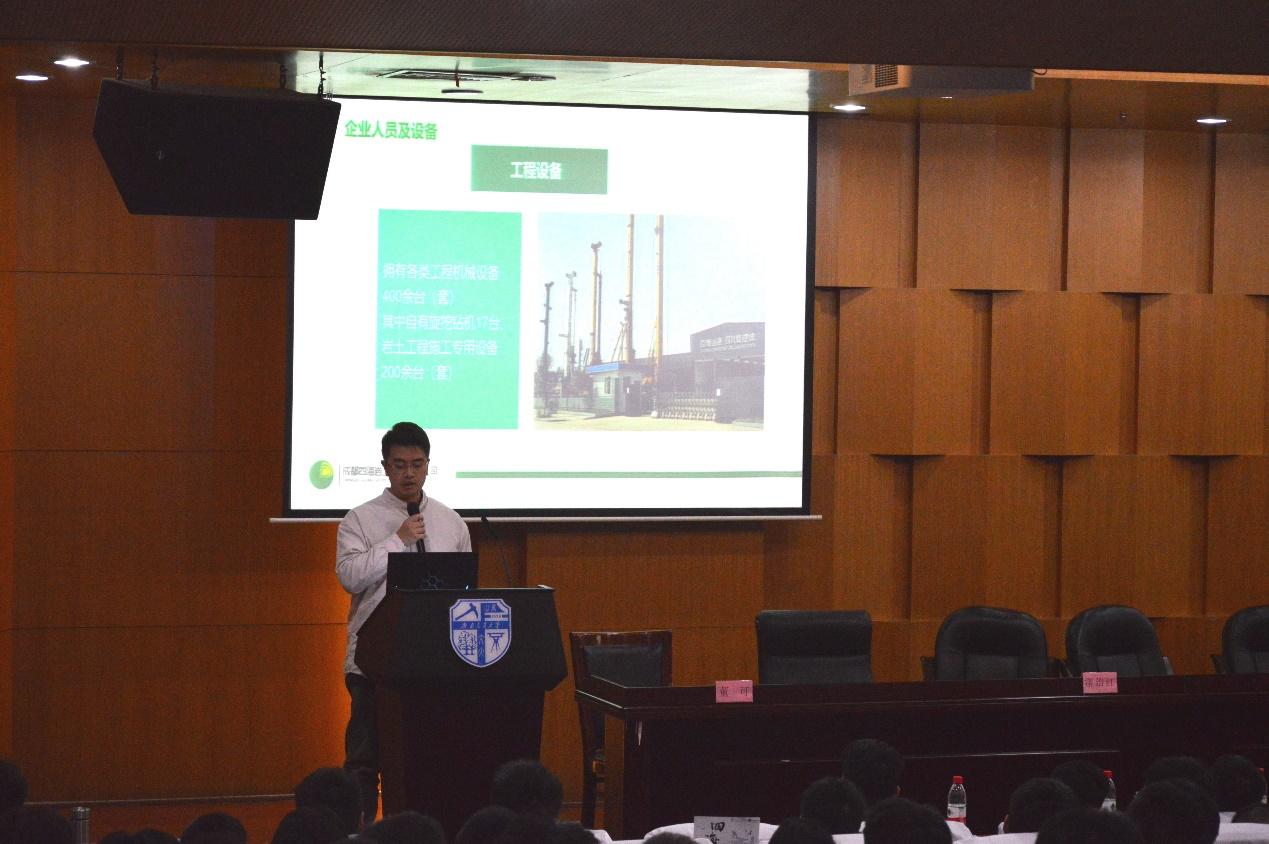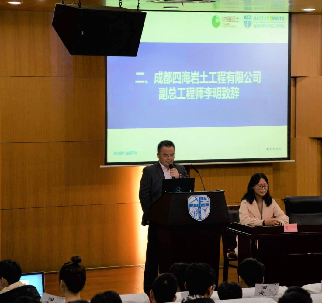 联合成都四海岩土工程有限公司于图书馆二号报告厅举办大学生岩土工程竞赛宣讲会。四海岩土工程有限公司副总工程师李明、人力资源总监徐艺、工程师陈挺、每日大赛