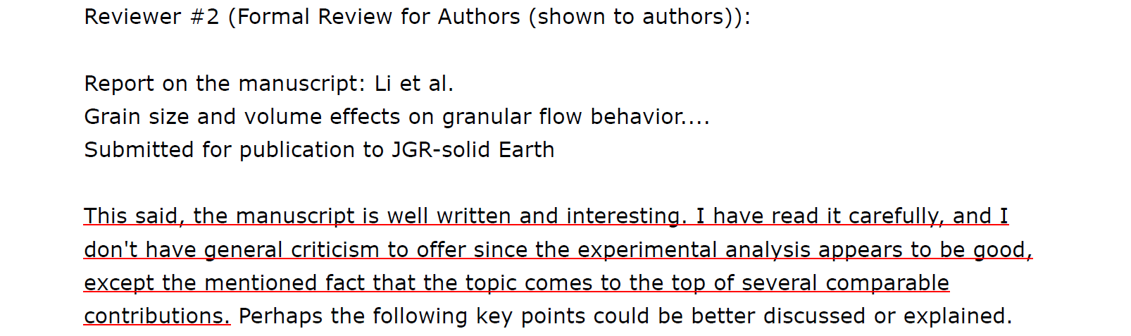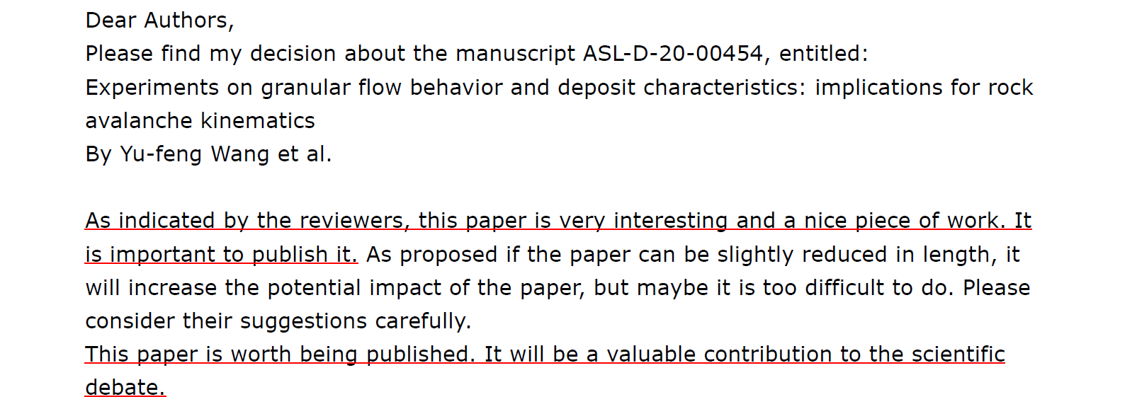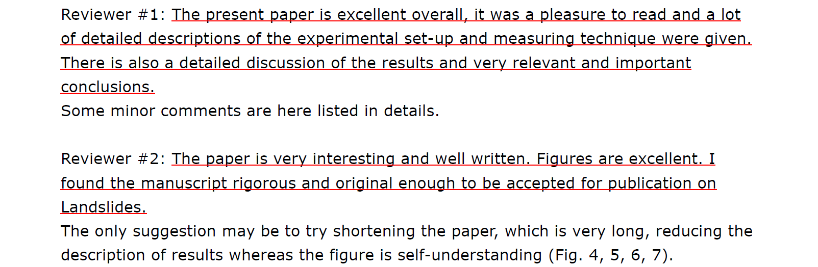 这一长达21页的研究论文,近期发表在国际工程地质和地质灾害领域著名期刊《Landslides》。由于该项成果中研究手段的先进性及研究问题的前瞻性,获得了审稿人及主编的高度评价(图7“本论文总体非常出色,对许多实验设计及监测方法进行了详细地说明,并得出了非常相关和重要的结论;这篇论文很有趣,写得很好,图件非常出色,其严谨性和原创性足以在Landslides期刊上发表;论文的研究主题在一些可比性较高的研究中其贡献是最为突出the topic comes to the top of several comparable contributions;论文非常值得发表,它将为科学的辩论做出有价值的贡献……”