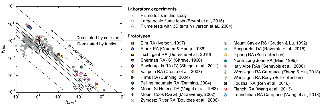 5)统计分析结果表明,对于真实尺度下的高速远程滑坡,其Savage大多低于0.1,流态总体表现为密集态,即密集颗粒流(dense granular flow)(图6),因此这种密集颗粒流的运动状态是高速远程滑坡堆积体中层序保留、表面流态化地貌形态等典型堆积特征发育的重要前提。