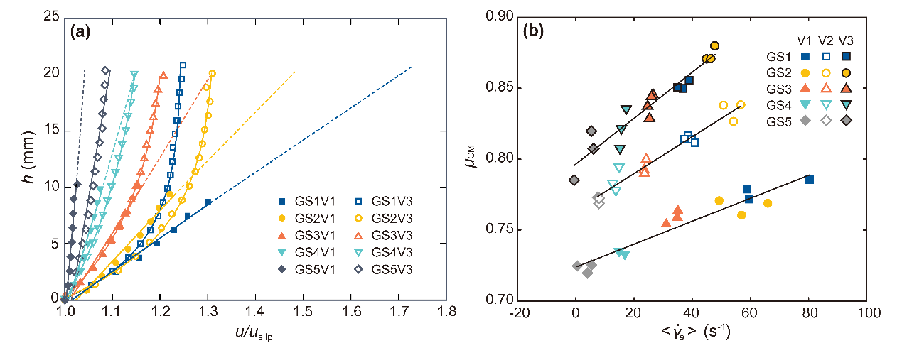 4  (a) 不同粒径及体积条件下的颗粒流平均速度剖面(b) 平均剪切速率与等效摩擦系数关系