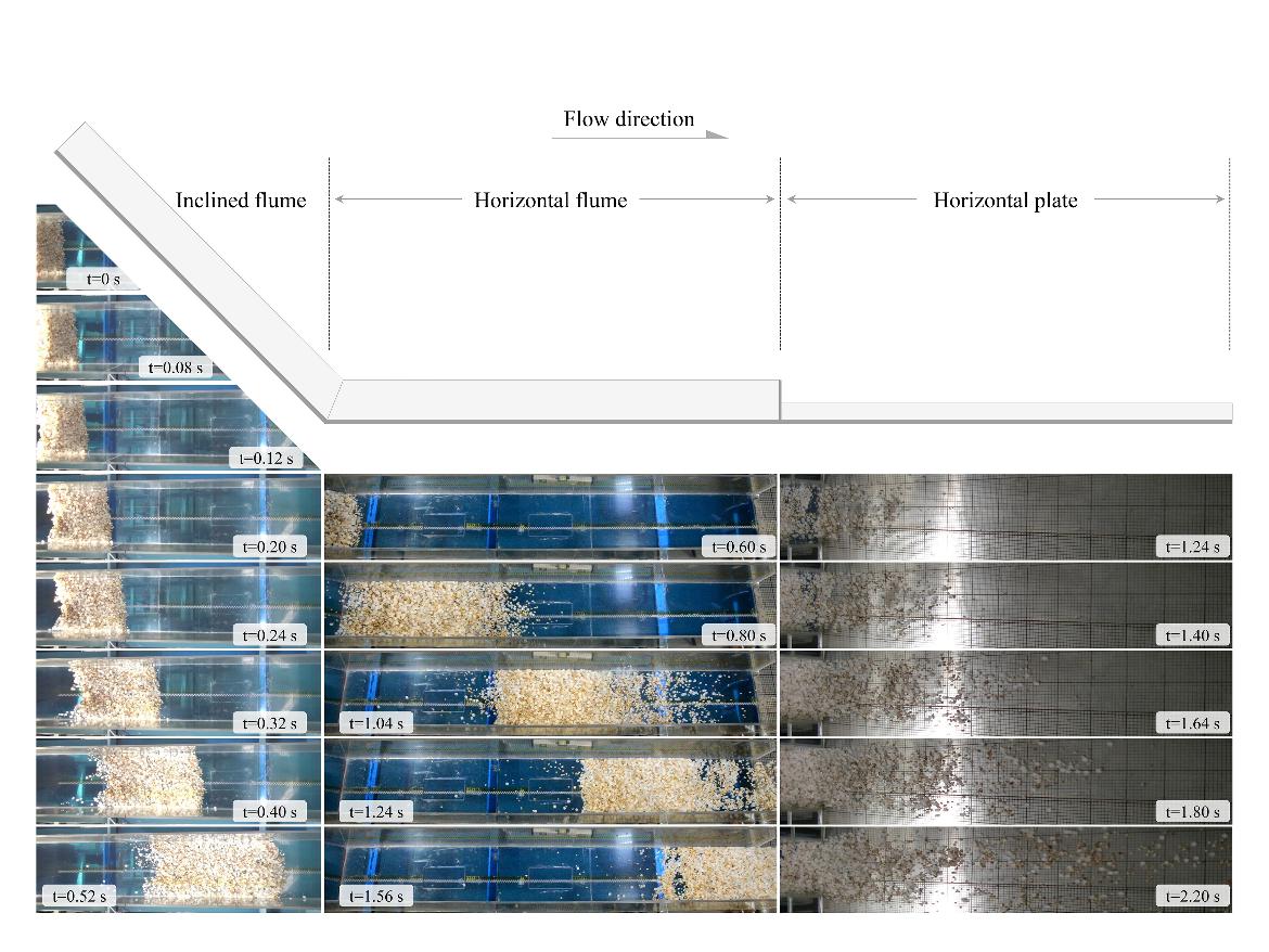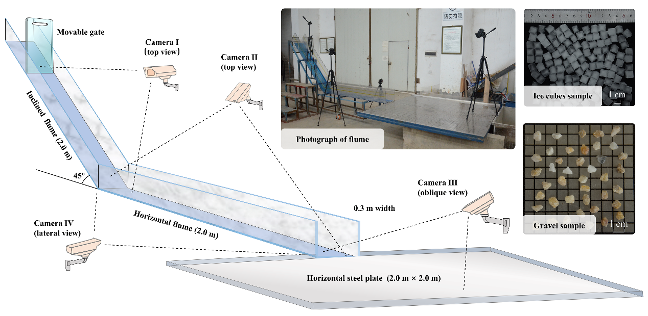 我院程谦恭教授团队致力于高速远程滑坡动力学机理的研究,取得了一系列标志性成果,极大丰富和发展了高速远程滑坡动力学理论。近期,针对冰-岩碎屑流的冰屑影响机理,硕士生任雨豪、副教授杨情情等科研团队成员自行设计了物理模型实验系统,以砾石和方形冰块为相似材料,通过配制不同固液含量的冰-岩混合物进行了一系列斜槽试验,模拟了冰-岩碎屑流在运动过程中的少量冰屑融化,从而在斜槽实验中实现了少量冰融水对冰-岩碎屑流运动特性影响机理的定量分析。实验结果表明:冰融水不仅可以润滑减阻,在某些情况下反而成为增阻剂。当融水量较少时,冰屑-岩屑会重新冻结成团,冰-岩重冻体将降低冰-岩碎屑流的运动性;当融水量较多时,岩屑表面受融水水膜润滑,冰-岩碎屑流冲出更远;当融水量进一步增多,冰-岩混合材料受基质吸力而呈现簇状分布,其运动性降低。由此可见,冰屑融化程度对冰-岩碎屑流的运动性至关重要。另外,研究还发现了砾石的动态含水量为2.2%左右。当含水量大于2.2%时,多余水分不能保持在砾石表面,在随砾石运动过程中将被“甩出”。这种水分重分布也将影响冰-岩碎屑流的运动性。研究成果模拟并重现了冰-岩碎屑流从启动到堆积的动力学全过程,首次揭示了冰屑作为物质组分和融水来源对冰-岩碎屑流运动特性的影响机制。审稿人给予了高度评价:“我认为作者在设计、开展试验,以及描述阐释试验结果方面都做得非常好,我非常希望看到这篇论文发表(In my opinion, the authors have done a very good job in setting up and conducting the experiments, and in structuring, describing, and illustrating their work. I would certainly like to see this manuscript published)”;“试验采用了很多巧妙的解决方案,并进行了很好的阐述。这项研究有助于更好地理解冰-岩碎屑流的运动机理以及改进相关灾害评估(Experiments are conducted with some clever ideas and are well descried. This study may be helpful in better understanding the propagation mechanisms of rock-ice avalanches and for improving relevant hazard assessment)”。