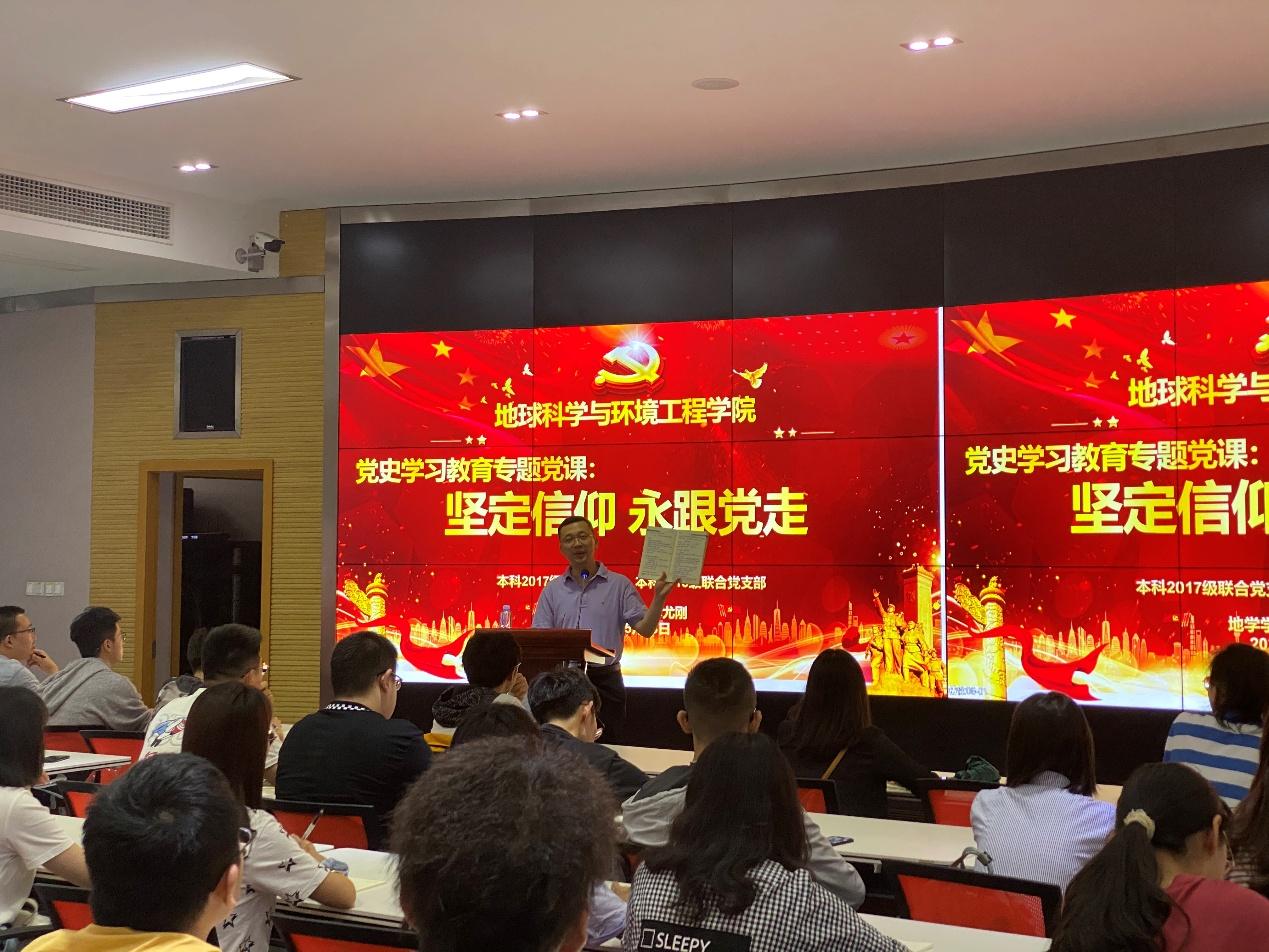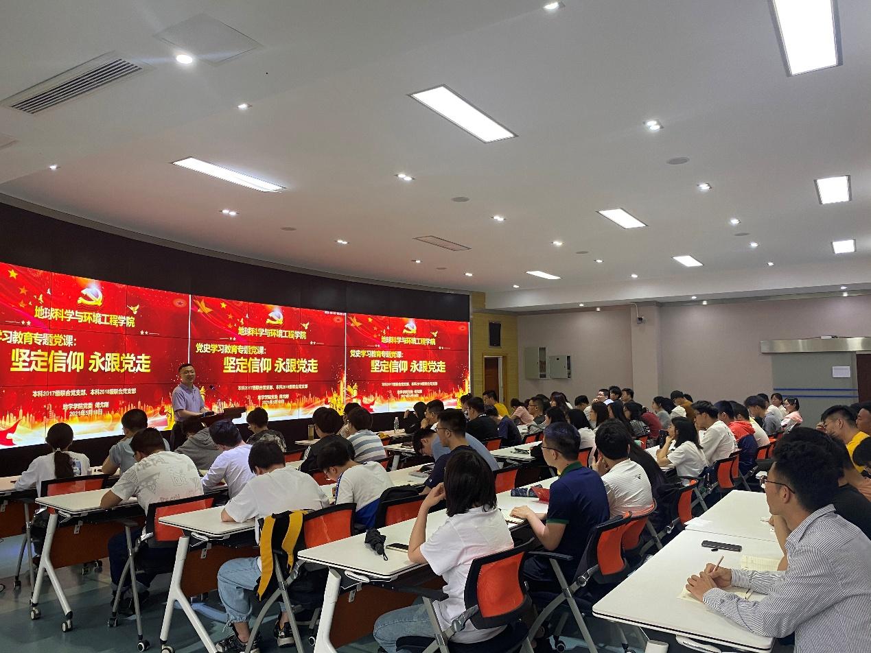 5月18日,地球科学与环境工程学院党委副书记傅尤刚于X4243多功能报告厅,面向本科2017级联合党支部和本科2018级联合党支部开展党史学习教育专题党课,党课以“坚定信仰,永跟党走”为主题。本2017级辅导员老师翟琦主持,学院本科2017级联合党支部、本科2018级联合党支部全体党员参加学习会。
