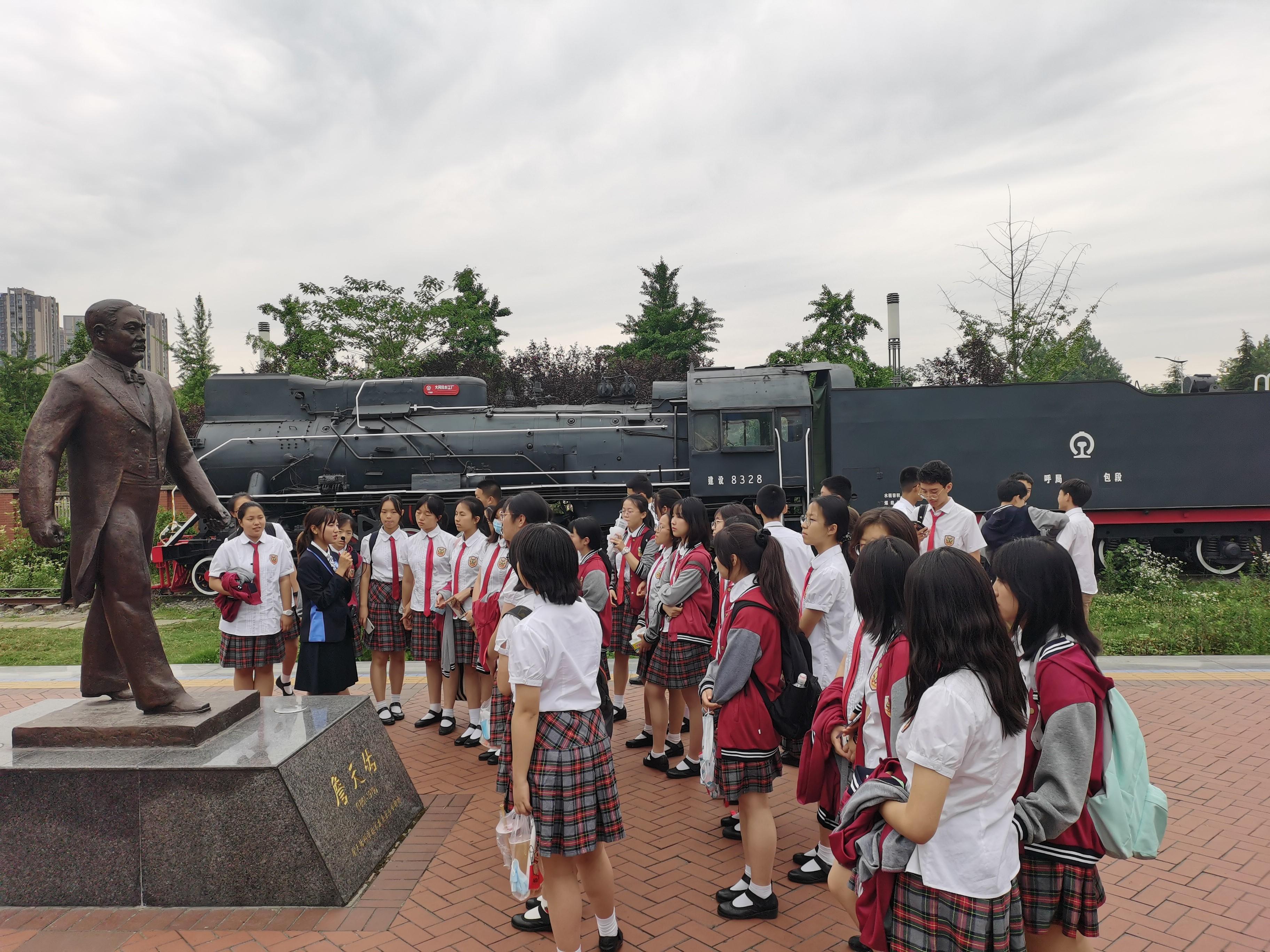 在校园大使的带领下,同学们走过了人文中轴线,先后参观了孙中山先生雕像、浮雕墙和“竢实扬华”牌匾,了解了交大各个时期不同的校徽及其含义,并欣赏了交大校歌。来到机车博物园,门口停放的机车头吸引了大家的目光,引得众人纷纷留影纪念。