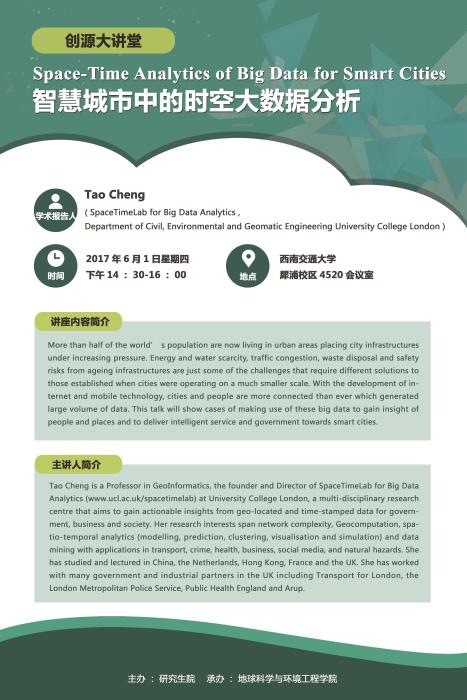 Tao Cheng is a Professor in GeoInformatics, the founder and Director of SpaceTimeLab for Big Data Analytics (www.ucl.ac.uk/spacetimelab) at University College London, a multi-disciplinary research centre that aims to gain actionable insights from geo-located and time-stamped data for government, business and society. Her research interests span network complexity, Geocomputation, spatio-temporal analytics (modelling, prediction, clustering, visualisation and simulation) and data mining with applications in transport, crime, health, business, social media, and natural hazards. She has studied and lectured in China, the Netherlands, Hong Kong, France and the UK. She has worked with many government and industrial partners in the UK including Transport for London, the London Metropolitan Police Service, Public Health England and Arup.