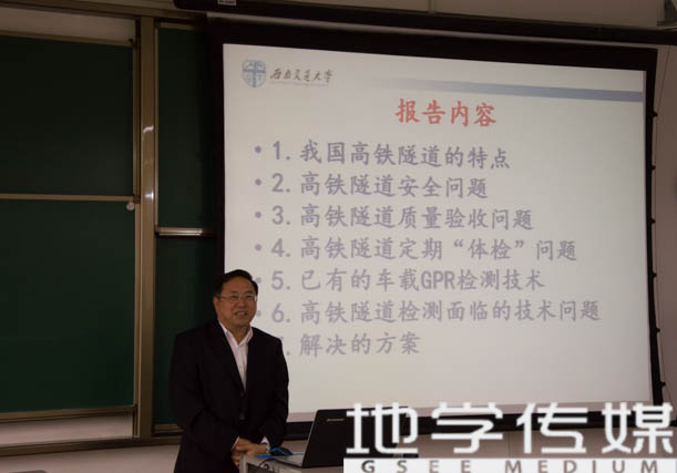 Ma Huimin focused on the stability of tunnel and landslide and introduced the research situation of tunnel and landslide stability, the tunnel-landslide system type and tunnel stress deformation mode, the interaction mechanism between tunnel and landslide, the principle of prevention and cure of tunnel landslide, the technology of pre-reinforcement. Hu Xinguo combined the shallow gas survey of the South Bank of Hangzhouwan Bridge, the Subsea tunnel project of Xiamen East Corridor and the Wuhan 27 Yangtze River Bridge, and introduced the engineering reconnaissance technology of the bridge and tunnel in the unfavorable geological condition. Finally, professor Zan Yuewen introduced the characteristics of high-speed railway tunnels in China, safety problems, quality acceptance problems, regular "physical examination" problems of high-speed railway tunnels, and existing vehicle GPR detection techniques.