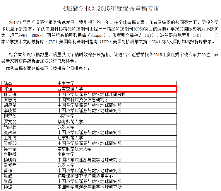 Prof. Chen Qiang is awarded the title of the excellent reviewer of Journal of Remote Sensing
