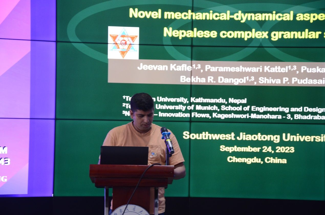9月24日下午第二场,Jeevan Kafle副教授作题为《New Insights Into the Mechanical and Dynamic Characteristics of Native Nepalese Complex Granular Slides》的学术报告。滑坡及其滑动距离、堆积地貌的复杂性往往受到颗粒性质、组分、体积、地形及运动路径上的障碍物的影响。Kafle教授以尼泊尔特有的物质为滑体材料进行斜板实验,该实验为揭示滑体运动过程、堆积地貌特征提供新的见解。此外,Kafle教授简要介绍滑坡失稳入水产生海啸或涌浪这一特殊的现象,从单相流模型到多相流模型其本构方程的发展过程为切入点,在梳理前人研究成果的基础上,引入其研究中所用本构模型,并通过数值模拟深入剖析其运动学和动力学。