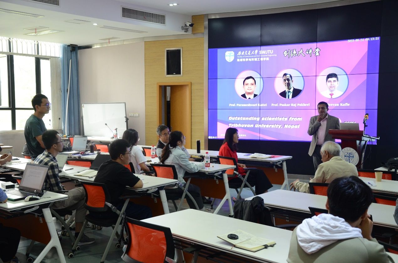 为推动国际化示范学院建设,开阔师生国际视野,提高师生科研能力,营造良好学术氛围,我院程谦恭教授团队特邀来自尼泊尔特里布文大学的Parameshwari Kattel、Puskar Raj Pokhrel和Jeevan Kafle三位副教授开展学术交流活动。三位学者长期从事颗粒流研究,擅长从力学和数学的角度出发,开展滑坡、泥石流等不同类型地质灾害运动演化过程研究。本次活动以线下与线上会议相结合的方式开展,累计70余人次参会。参会人员认真听取学习了3位学者的学术报告,并在会后积极与学者交流,受益匪浅。